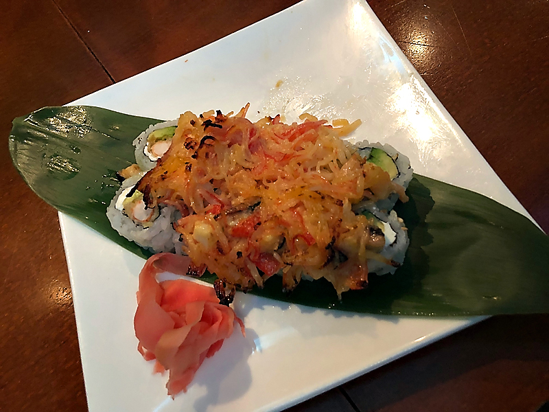 The Volcano has tuna, asparagus, cream cheese on the inside, and avocado, spicy baked scallops, krab, masago, and scallions piled on top. Y’all, I can’t even handle how good this roll is; you MUST try it if you’re ever in Orlando.
