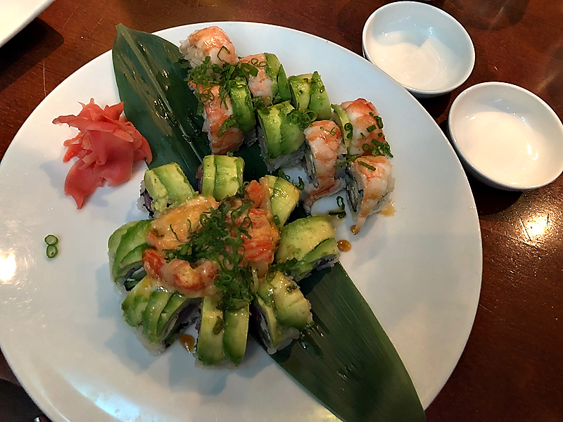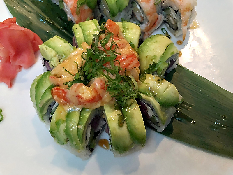The Millennium roll is shrimp tempura, cream cheese, and cucumber, topped with shrimp, avocado, eel sauce, and scallions.